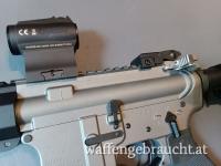 Verbaut sind: Fortis HAMR Ladehebel, Beidseitige Sicherung, Back Up Iron Sights, Holosun Green Dot, Ase Utra Flashhider, DFCO Hand Stop.