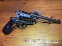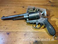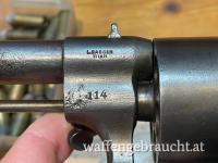 Revolver Gasser 1870 mit der Seriennummer 114 aus der Erstserie. Das Züngel ist auch noch sichtbar nummeriert. Am Laufgehäuse und an der Trommel ist jeweils die Fertigungsjahreszahl 71 (für 1871) angegeben, auf der Laufoberseite ist der Prüfstempel 73 (1873).