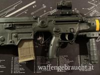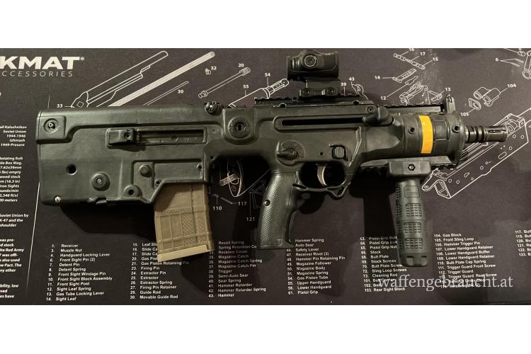 Verkauft wird eine IWI Tavor X95 bzw. Micro Tavor, die aus israelischen Polizeibeständen zu stammen scheint (darauf weist die MSW Markierung hin). Der Zustand ist dementsprechend gebraucht, die Waffe ist aber voll funktionsfähig (blanker Lauf etc).