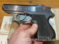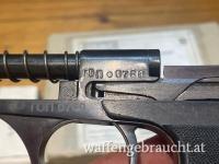 Ein besseres Gesamtset wird man kaum noch finden. Insgesamt wurden mit dieser Pistole 3 Packungen Munition verschossen, also genau 108 Schuss, die Waffe ist also wie neu. Das Ersatzmagazin wurde einmal verwendet und ist nummerngleich zur Waffe, nach Gebrauch wurde es wieder im Originalpapier eingewickelt. Die Originalverpackung mit dem originalen Verpackungspapier ist wunderschön erhalten. In diesem Zustand ist dieses Set wohl ein Unikat und sollte wieder Teil einer Sammlung werden.