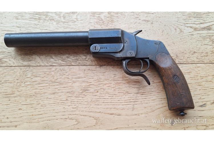 Schöne Leuchtpistole aus dem 1.Weltkrieg. Hersteller Gebrüder Rempt, sehr schön bestempelt. Selbst die Systemschrauben sind mit der Seriennummer original bestempelt.