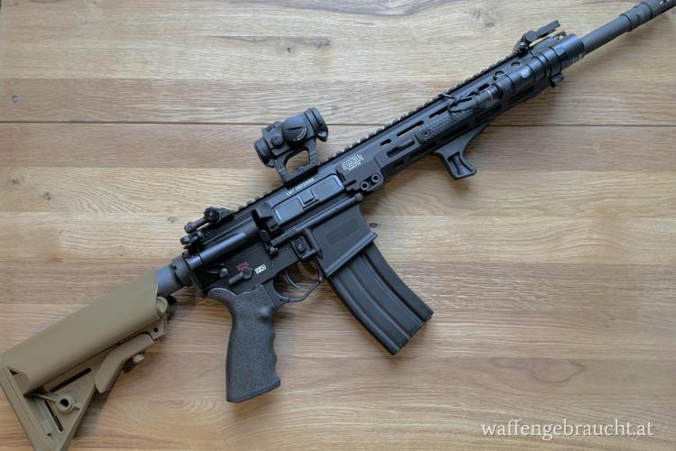 Es wurden etwa 300 Schuss gemacht. Lauflänge 14,5 Zoll. Die Waffe ist extrem Modular und kann neben unterschiedlichen Kalibern 5.56 oder .300 BLK mit wenigen Handgriffen auch von Piston auf Direct Impingement umgestellt werden. Wer also eine aussergewöhnliche AR haben möchte ist da goldrichtig! Auch der Trigger ist speziell und kann auch im abgeschlagenen Zustand gesichert werden (wie bei der HK416). Die Waffe kommt in der Originalbox von LMT und Blueforce Riemen. In Österreich kaum zu bekommen.