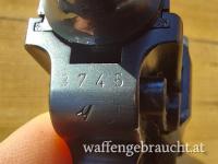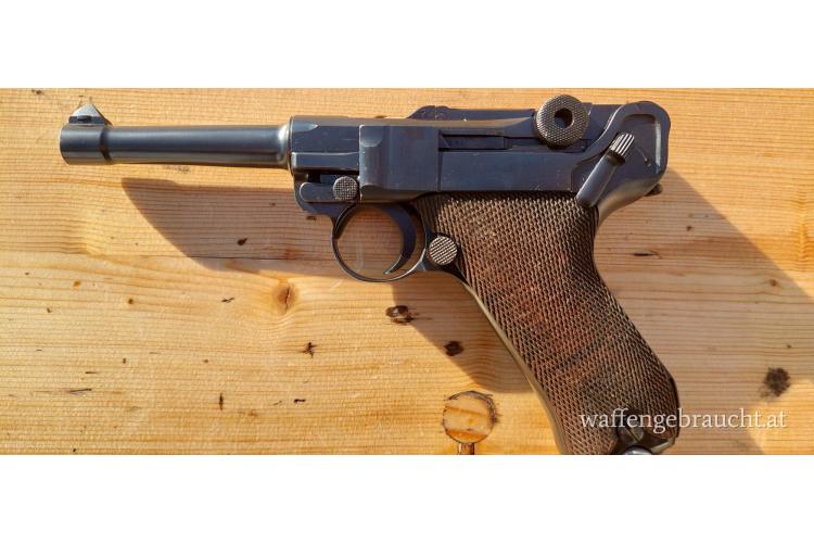 Verkaufe eine nummerngleiche (ausgen Magazin) Pistole 08 mit gutem Lauf. Der Lauf ist nicht ausgeschossen und blank; er hat aber im Bereich der Mündung leichte Narben. Die Waffe wurde vor langer Zeit professionell überarbeitet, da sie aufgrund der Lagerung im Holster rostnarbig war. Die Waffe ist jedenfalls für Ordonnanzschützen sehr gut geeignet, da sie ein gutes Trefferbild hat und nichts ausgeleiert ist.