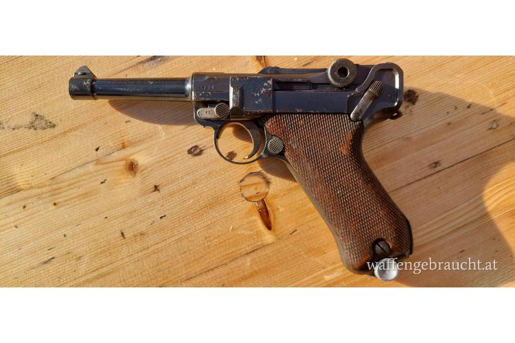 Zum Verkauf kommt eine Pistole Mauser 08 die so im Mai 45 in einem Bauernhaus in Niederösterreich liegengeblieben ist. Lauf, Schlitten und Verschluß sind Mauser und nummerngleich, das Griffstück ist DWM und in sich auch nummerngleich soweit ersichtlich. Der Lauf ist in hervorragendem Zustand und blank. Die Waffe unbefummelt, äußerlich keine ausgesprochene Schönheit aber voll funktionsfähig und keinesfalls ausgeleiert.