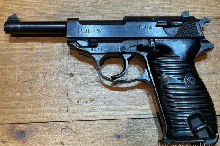 Pistole P38 byf 43, Laufzustand 2-. nicht nummerngleich (Griffstück ist von Walther und hat eine andere Nummer / Oberteil von Mauser und in sich nummerngleich), mit schöner Ätzung - Erinnerungsstück. Das Magazin ist auch nummeriert mit einer anderen Nummer, stammt wahrscheinlich von einer Polizei Variante.