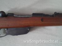 Steyr M95, äußerlich guter Zustand, das Laufinnere ist aber leider sehr rau, daher ist das eher eine Sammlerwaffe. Nummerngleich sind Lauf, Systemhülse, Schaft, Handschutz. Auf der Kolbenplatte befindet ein Stempel "LGKK" (wahrscheinlich Landesgendarmeriekommando Kärnten) An den anderen Teilen inkl. Verschluss finde ich keine Nummern. Inkl. Tragriemen und 10 Stk. Patronen in originaler Verpackung aus dem Jahr 1938.