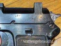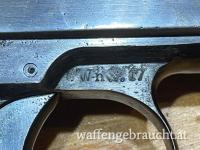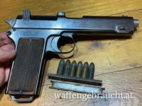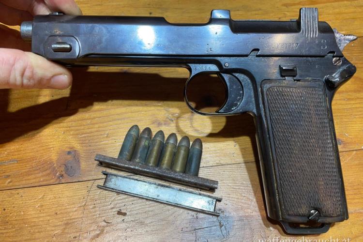Pistole Steyr Muster 12 mit Abnahme von 1917 im überarbeiteten Zustand (4) mit Narben. Laufzustand 4. Mit dabei sind 2 originale Ladestreifen mit 6 Patronen.