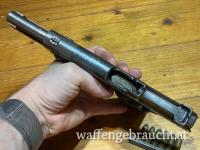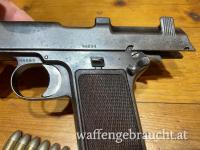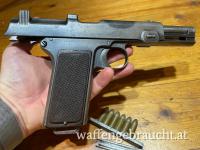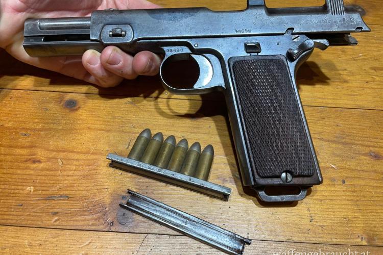 Pistole Steyr Muster 12 mit Abnahme von 1916 im abgegriffenen Originalzustand mit ein paar Närbchen. Laufzustand 3. Mit dabei sind 2 originale Ladestreifen mit 6 Patronen.