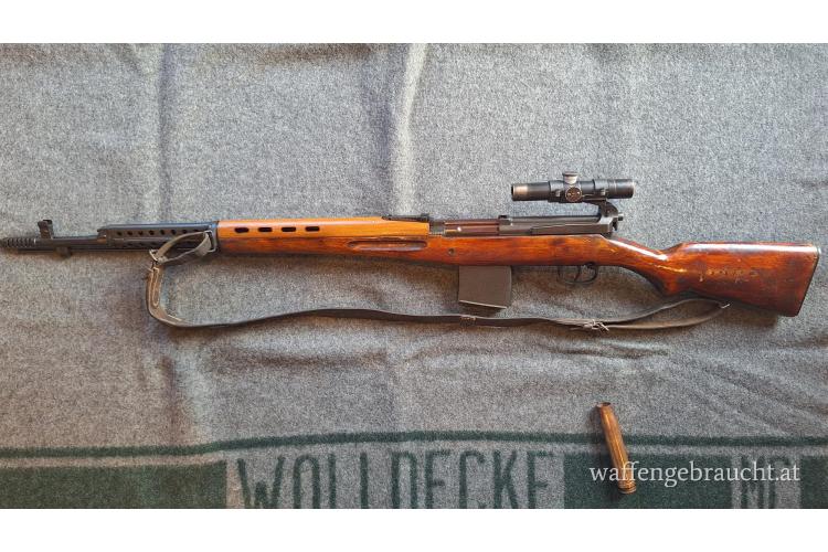 Verkaufe russischen frühen SVT40 in äu0erlich schönen Zustand. Die Waffe ist komplett nummerngleich und hat keinen Neubeschuß! Das angebaute ZF ist ein originales SVT-PU, erkennbar am dickeren Hülsendurchmesser von der Eintrittslinse bis zu Montage. Die Montage selber ist meines Erachtens Repro, passt aber gut zum Gesamtbild. Der Lauf ist jedoch durch die Verwendung von korrosiver Munition in Verbindung mit schlampiger Reinigung matt und daher das Schußbild einer Scharfschützenwaffe unwürdig. Mit dabei sind ein originales Magazin sowie ein originaler Lederriemen.