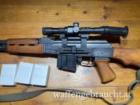 SSG Zastava M76, nummerngleich bis auf den Deckel, die ZF-Montage hat keine Seriennummer, da das ZF erst nachträglich neu angeschafft wurde. Die Waffe diente als Sammlerwaffe in meiner Systemsammlung, aber natürlich habe ich sie auch einmal auf den Schießstand ausgeführt. Gegen Aufpreis kann die Waffe neu beschossen werden, allerdings empfinde ich das als Wertminderung bei einer Sammlerwaffe.