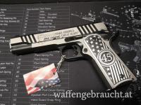 Kaliber .45Auto, ha.Pistole 1911A1 Trump One 7+1 Patronen Lauflänge 5Inch, Custom Limited Special Edition, Visier 3-Dot weiß in der Höhe nicht verstellbar, Stainless Steel mit Gravur, Bedienelemente schwarz, Alu Griffschalen Flag graviert,