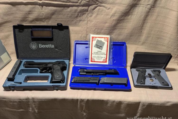 Verkaufe eine gepflegte Beretta 92FS, Kaliber 9mm Luger inkl. 22lr Conversion Kit von Arthur Ciener und Laser Griffschalen von Crimson Trace.