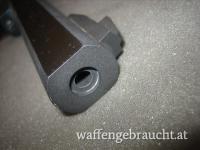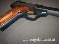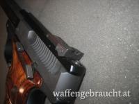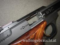 Beschreibung: Halbautomatische Kleinkaliberpistole aus Stahl mit Target Lauf. Das hinterschnittene Korn ist am Lauf verschraubt und wechselbar, die Kimme höhen- und seitenverstellbar. Alle Stahlteile sind brüniert, teilweise matt, teilweise glänzend.