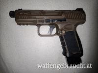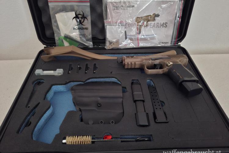 Die Pistole ist in 9x19 mm erhältlich und verfügt über eine einzigartige Beschichtung im "Used Look" die auf jeden Fall ein Blickfang ist. Die innenliegenden Abzugssystemteile sind für einen reibungslosen Betrieb und hohe Leistung vernickelt. Ein patentiertes Holster, Magazinladehilfe und Reinigungsset sind ebenfalls im Lieferumfang. Weiters wurde ein verlängerter Magazinknopf verbaut, Original liegt bei. Ein neuer passender Kompensator von Canik liegt bei, Neue verlängerte Daumenauflage liegt bei. Stärkere originale Verschussfeder liegt bei. Originaler Anschlagschaft zum draufstecken liegt bei.