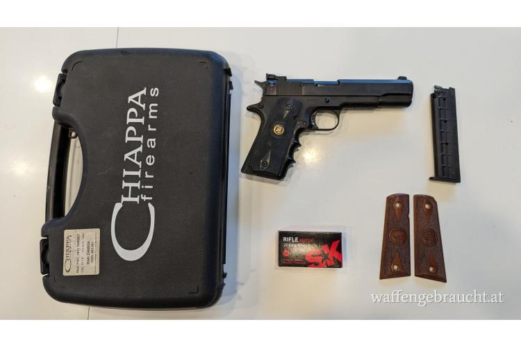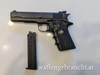 Optimal um günstig zu üben oder einfach nur Spaß zu haben. Präziser 5" Lauf. Kultiges 1911er Design. Alles im original Koffer mit den original Holz-Griffschalen. Optional können noch Pachmayr Griffschalen und Munition erworben werden.