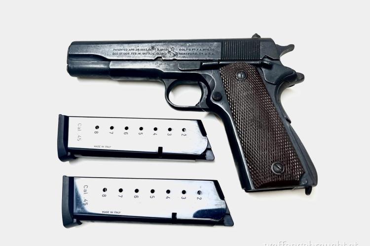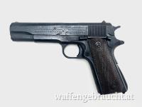 Angeboten wird eine Colt 1911 im Kaliber .45 ACP. Die Waffe befindet sich in einem gebrauchten Zustand und widerspiegelt ein Stück Geschichte. Teil des Angebots sind zwei neuwertige Magazine.