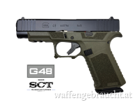 Fabriksneue Custom Glock 48 oder 43X mit verbautem SCT Manufacturing Griffstück in OD Green im Kal. 9mm Luger.