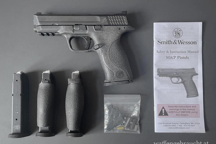 Inklusive aller Originalteile, Griffschalen und Anleitung, einer 5.11 Pistolentasche und M&P9 Reinigungsmatte von Tekmat.