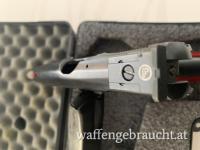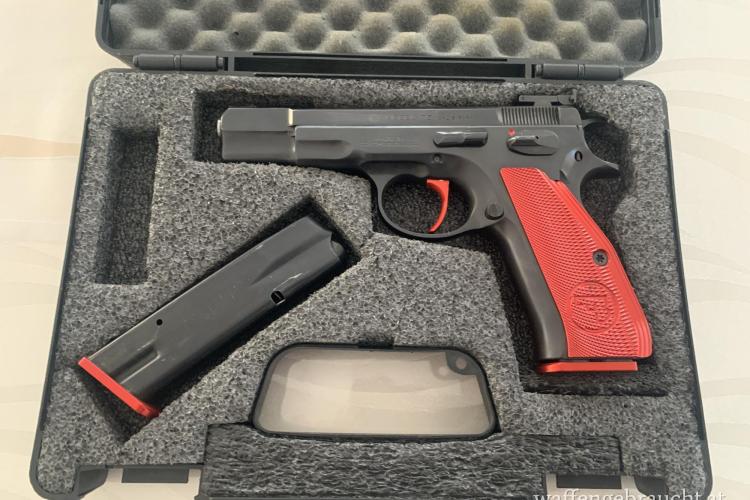 CZ 75 mit roten Alugriffschalen sowie Abzug und Magazinböden und verstellbare Visierung mit Fiberoptik.