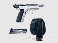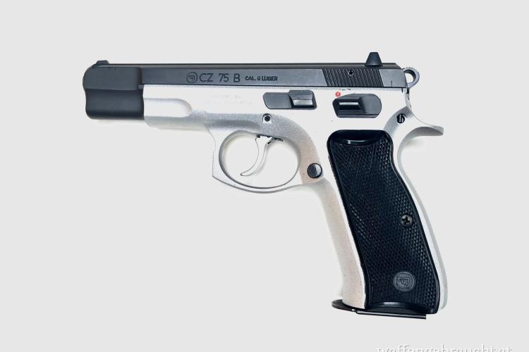 Angeboten wird eine CZ 75 B im Kaliber 9mm Luger. Teil des Angebots ist ein Kunststoffholster (rechts, außen) und ein zweites Magazin. Die Waffe weist sichtbare Gebrauchspuren auf und ist voll funktionsfähig.