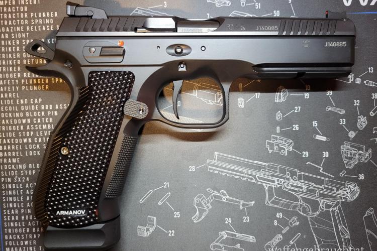 Zudem sind Armanov Ergo Griffschalen verbaut, die wesentlich besser in der Hand liegen als die flachen Standardgriffschalen. Sämtliche Originalteile sind noch vorhanden und werden mitverkauft. Magazinauswurf ist aktuell für Linkshänder montiert. Kann natürlich für Rechtshänder umgebaut werden.