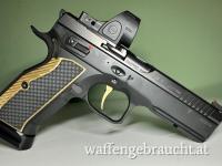 Darüber hinaus wurde die Pistole mit hochwertigem Zubehör ausgestattet: LOK Grips Griffschalen, Ultimate Trigger CZ Abzug mit goldener Abzugsfeder, Sportfedern, Magazinkopf aus Aluminium, vergrößerte Daumensicherung sowie ein vergrößerter Magazinauswerfer in Gold.