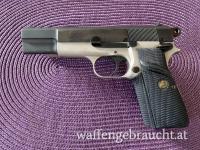 Schlitten matt mit polierten Seitenflächen. Griffstück und zugehöriges Magazin matt vernickelt,