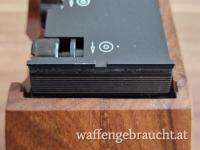 Fein justierbares Mikrovisier. Rechts am Patronenlager Firmenbezeichnung und Kaliberangabe. Links Waffennummer. Am schwarzen Kunststoffvorderschaft On/Off-Schalter des elektronischen Systems. System brüniert, ergonomische Holzgriffschalen UNVERBASTELT !!!