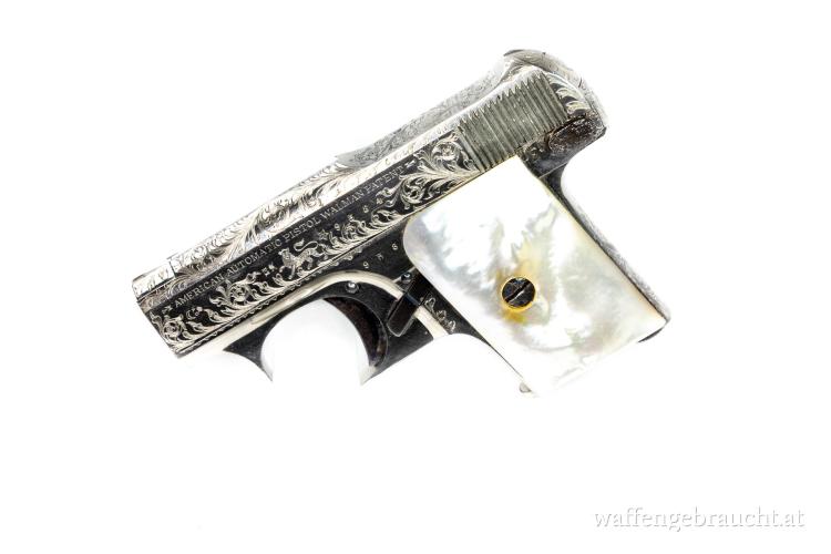 Gebrauchtes Unikat einer Walmann American Automatic Pistol, reich graviert mit Perlmuttgriffschalen.