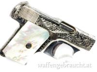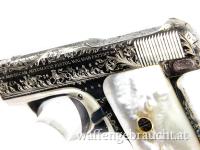 Die Walman American Automatic Pistol ist eine kompakte Pistole die normalerweise in einem schlichten Erscheinungsbild auftritt. Nicht jedoch bei dieser. Dieses Unikat ist umfangreich graviert und kommt mit Perlmuttgriffschalen. Ein wahrer Blickfang für jede Sammlung.
