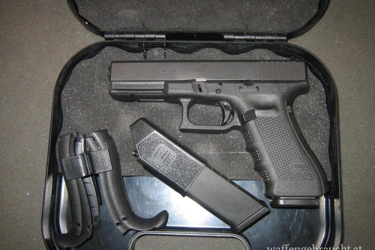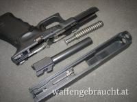 Beschreibung: Halbautomatische "Safe Action Pistol" nach Patent der Firma Glock mit drei automatischen Sicherungen ( Abzugssicherung, Schlagbolzensicherung, Fallsicherung). Kaltgehämmerter Lauf, Magazinkapazität 17 Patronen.
