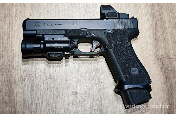 Verkaufe Glock 34 Gen 5 MOS ! Die Waffe ist in sehr guten Zustand und ist Neuwertig. Verbaut ist ein Timney Alpha Competition Trigger, ein Toni System Steel Rod Guide mit einer 13 lb Feder, eine Pistolenlampe mit Stroboskope Funktion, Grip Tape, Aluminium Magwell, Magazin Erweiterung 4 x,