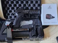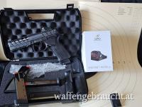 Lieferumfang: Koffer, Bedienungsanleitung, Reservemagazin, 3 Griffrücken, kleinere Sicherungshebel, Adapterplatte für Shield Red Dots