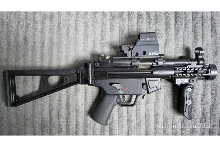 Verkaufe eine wenig geschossene H&K SP5k mit Klappschaft und 8 Stück 20 Schuss Magazinen, Fab Defense Handguard und RedDot Sightmark Ultrashot. Ein zusätzlicher Hebel zum leichteren Entfernen der Magazine wurde eingebaut.