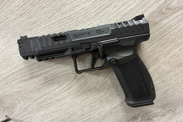 Kein anderer Name könnte das Design so deutlich ausdrücken: Jetzt hat ein überlegenes Modell die Bühne betreten, das alle anderen Pistolen herausfordern kann. Mit Funktionen, die speziell darauf ausgelegt sind, die Konkurrenz auszustechen, wie einem verbesserten Biberschwanz, aggressiven Riffelungen des vorderen Schlittens, einem tieferen Abzugsbügelwinkel, einer neuen Holster-Fit-and-Lock-Funktion (HFL) und dem neuen selbstaufweitigen Magazinschachtrahmendesign. Durch das neue Rahmendesign mit verstellbarer Kimme und Glasfaser-Kornvisier werden die Manövrierfähigkeit und Zielerfassung der Pistole deutlich verbessert. Die SFx RIVAL verfügt über einen modularen Rahmen, der eine einfache Demontage der Waffe ermöglicht. Mit diesem Design kann der Benutzer seine Pistole aus der Verpackung bis in ihre kleinsten Teile zerlegen und sie dann mit nur dem CANiK-Stanzwerkzeug wieder zusammensetzen. CANiK verwendet weiterhin die weltweit fortschrittlichste Technologie im Abzugsdesign, um den diamantgeschliffenen, 90°-Winkel-Abzug aus leichtem Aluminium der SFx RIVAL zu entwickeln, der zusammen mit der verkürzten Voreinstellungs- und Rückstelldistanz Geschwindigkeit und Genauigkeit erhöht. Neben all diesen technischen Verbesserungen wurden bei der Entwicklung von RIVAL auch ästhetische Aspekte berücksichtigt: Mit einer einzigartigen Beschichtungsfarbe namens Canik Rival black, die von Cerakote exklusiv für CANiK entwickelt wurde und auf Rahmen und Schlitten aufgetragen wird, sowie auf Abzug, Magazinauslöser, Magazinbodenplatte, Magazinschacht und Schlittenfanghebel, ist diese Waffe auf jedem Schießstand ein echter Hingucker.