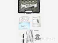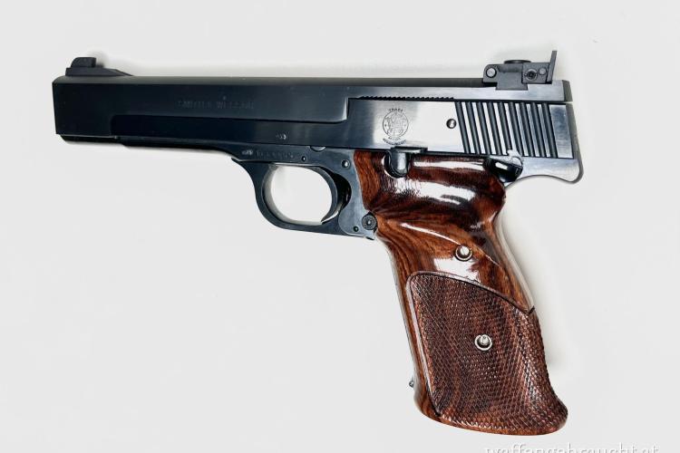 Angeboten wird eine Kleinkaliberpistole von Smith & Wesson. Das Modell 41 wird von Wettbewerbern auf nationaler Ebene für höchste Präzision im Wettkampf eingesetzt und gilt als eine der besten .22-Zielpistolen, die jemals hergestellt wurden. Rahmen und Schlitten bestehen aus einem Karbon-Stahl Mix. Die Holzgriffschalen sind besonders ergonomisch angefertigt.