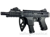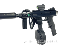 Sehr schön gefertigte halbautomatische Pistole/Selbstladegewehr mit einem aus dem vollen gefrästen Stahlgehäuse, so wie es früher einmal war . (Unseren Wissens nach, die Einzige!) Kompatibel mit Glock Magazinen. Ausgestattet mit einem Quadrailvorderschaft, Klappschaft und beidseitig bedienbarer Sicherung. Der Ladehebel kann links oder rechts der Waffe angebracht werden. Des weiteren besteht die Möglichkeit ein Reservemagazin im Griffstück anzubringen.