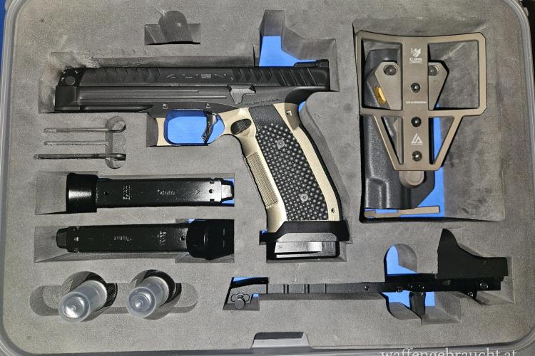 Zum Verkauf steht eine gebrauchte Laugo Arms Alien 500, eine limitierte Sportpistole, die für ihre besondere Konstruktion und ihr präzises Schussverhalten bekannt ist. Das Modell zeichnet sich durch einen fixierten Lauf und eine sehr niedrige Laufachse aus, was im sportlichen Einsatz für ein stabiles Schussbild sorgt.
