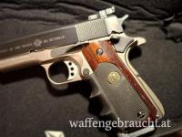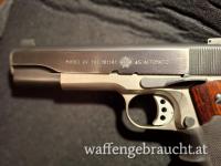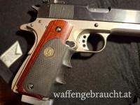 Sehr gepflegte, wenig beschossene Norinco Modell 1911A1 Kaliber 45acp. Duotone, makellose Brünierung bis auf leichten Abrieb bei der Laufmündung. Montiert ist ein Pachmayr Edelholzgriff mit eingelassenem Gummigrip Vorderteil