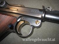 Beschreibung: P.08 Artillerie, mit Feinverstellung der Kimme und des Kornes, Holzgriffschalen der Firma K&N ( Nill), Das Magazin ist zugehörig aber nicht nummerngleich und der Patronenauszieher hat keine Nummer, ansonsten nummerngleich.