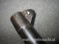 Zustand: vom Sportschützen optimiert, Abzugsgewicht 1,15kg, blanker Lauf mit scharfen Feldern, eingeschossen auf 25 Meter "Fleck", Die Streichbrünierung ist im Originalzustand mit zum Teil blanken Kanten, die Bedienteile wurden neu vergoldet. Am Kornansatz ist auf der linken Seite eine alte konservierte Rostnarbe. ( letztes Foto). Die Pistole schießt sehr präzise und hält mit selbst gemachter Munition auf 25 Meter die 10 auf der Schnellfeuerscheibe.