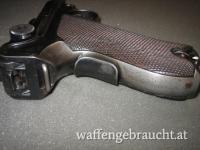 neuwertiges Magazin ( hochglanzvernickelt mit Kunststoffboden, ohne Nummer), originale Holzgriffschalen mit etlichen Druckstellen aber ohne Risse oder Fehlstellen. Gebrauchspuren an den Kanten und abgegriffene Brünierung an der Handballensicherung und am Griffstück. ( nicht nachbrüniert)