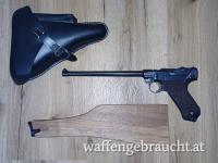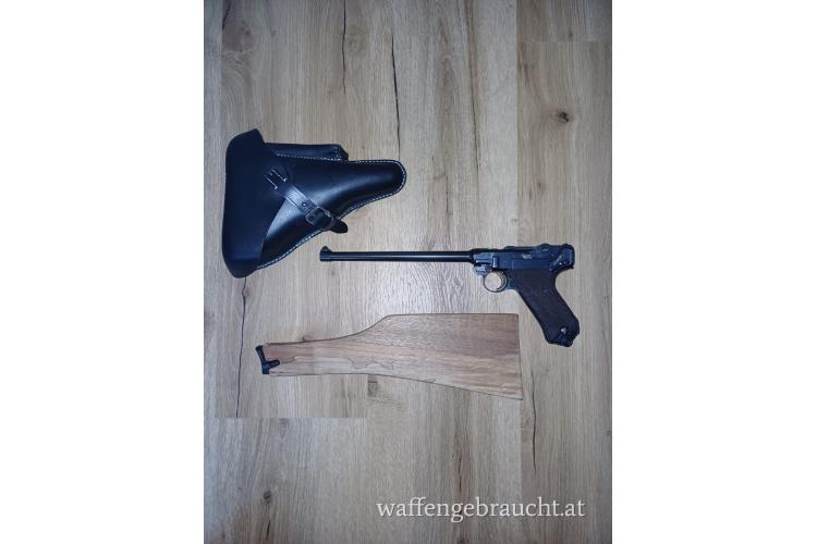 Hallo verkaufe meine P08 Erfurt 1914 in gutem gebrauchten Zustand mit nachbau Magazin langer lauf innen wie neu inklusive Anschlag Schaft eigenbau und holster bei Fragen 06507676125 danke liebe Grüße Basti