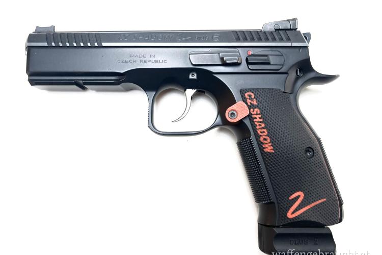 Angeboten wird eine CZ Shadow 2 Blue Grip mit Wechselgriffschalen des Target Modells sowie dessen Magazinauslöser. Teil des Angebots ist der Originallieferumfang in einem hervorragenden Zustand (Koffer, Gebrauchsanleitung, 3x Magazine mit Magazinverlängerung - (Putzbürste fehlt).