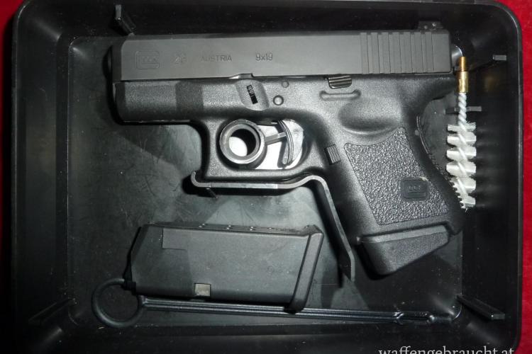 Pistole, Glock, Mod.: 26, Kal.: 9mm Para, Nr.: CHT865, Lauflänge: 87mm, zwei Magazine, höhen- und seitenverstellbares Visier, gebraucht, sehr guter Erhaltungszustand, der Lauf innen spiegelblank, die Brünierung nur an manchen kanten ein wenig abgerieben, Wiener Beschuß, dazu die Originalverpackung aus schwarzem Kunststoff