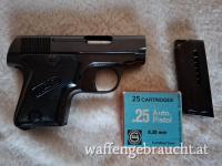 Pistole MBA Modell A, Kaliber 6,35mm Browning, 5-Schuß Magazin, massive Ausführung, leichte Gebrauchsspuren, schußbereit.