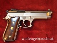 Pistole, Taurus, Mod.: PT99AF, Kal.: 9mm Para, Nr.: TJI58472, Lauflänge: 125mm, ein Magazin, helles Leichtmetallgriffstück, der Lauf und der Verschluß matt vernickelt, höhen- und seitenverstellbares Visier, beidseitige Drehhebelsicherung, originale Holzgriffschalen, gebraucht, sehr guter, fast neuwertiger Erhaltungszustand, Ferlacher Beschuß aus der ersten Hälfte der 1990er-Jahre