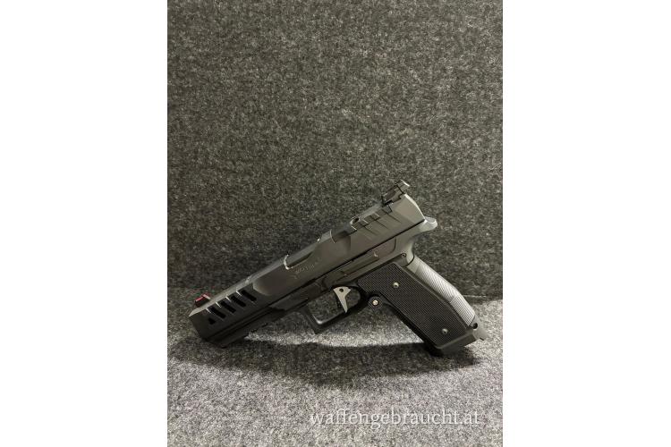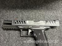 DPM Rückstoßdämpfung, LPA Fiberglasvisier für schnelle Zielaufnahme, verlängerter Magazinauswurf und aggressive Griffschale (beides von der Walther-Meistermanufaktur) — alles fachgerecht montiert.