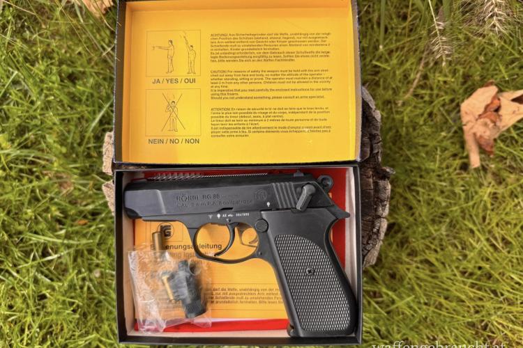 Röhm RG 88 selbstladende Signalpistole mit Aufsatz zum Aufschrauben auf Laufgewinde. Original Box mit Anleitung, 2 Patronen, Aufsatz.