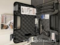 Vier austauschbare Palmswell-Griffeinsätze für optimale Handpassung und Abzugsreichweite – S, M, ML, L und 4 Magazine zu je 17 Schuss. Sowohl die griffschalen als auch 3 Magazine wurden nie benutzt.